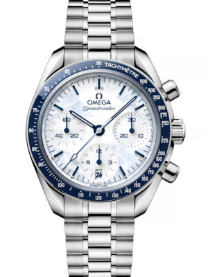 Die Uhr besitzt ein 38 mm Edelstahlgehäuse, das Robustheit und Eleganz perfekt miteinander verbindet. Die blaue Keramiklünette mit ihrer Tachymeterskala aus weißer Emaille sorgt nicht nur für einen starken visuellen Kontrast, sondern unterstreicht auch die sportliche DNA der Speedmaster. Das winterliche Thema setzt sich auf dem Zifferblatt fort: Das lackierte weiße Blatt wird durch einen mattierten blauen Aufsatz ergänzt, der ein Fingerabdruckmuster trägt – inspiriert vom offiziellen Emblem der Milano Cortina 2026.