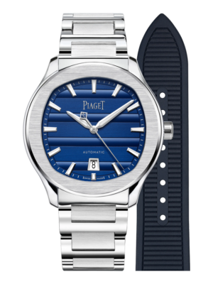 Ein besonderes Highlight ist die Vielseitigkeit des Designs. Das Edelstahlarmband lässt sich einfach austauschen und wird durch ein zusätzliches dunkelblaues Kautschukarmband ergänzt, das der Uhr eine sportlichere Note verleiht. So passt sich die Piaget Polo Signature Date flexibel unterschiedlichen Stilen und Anlässen an.
