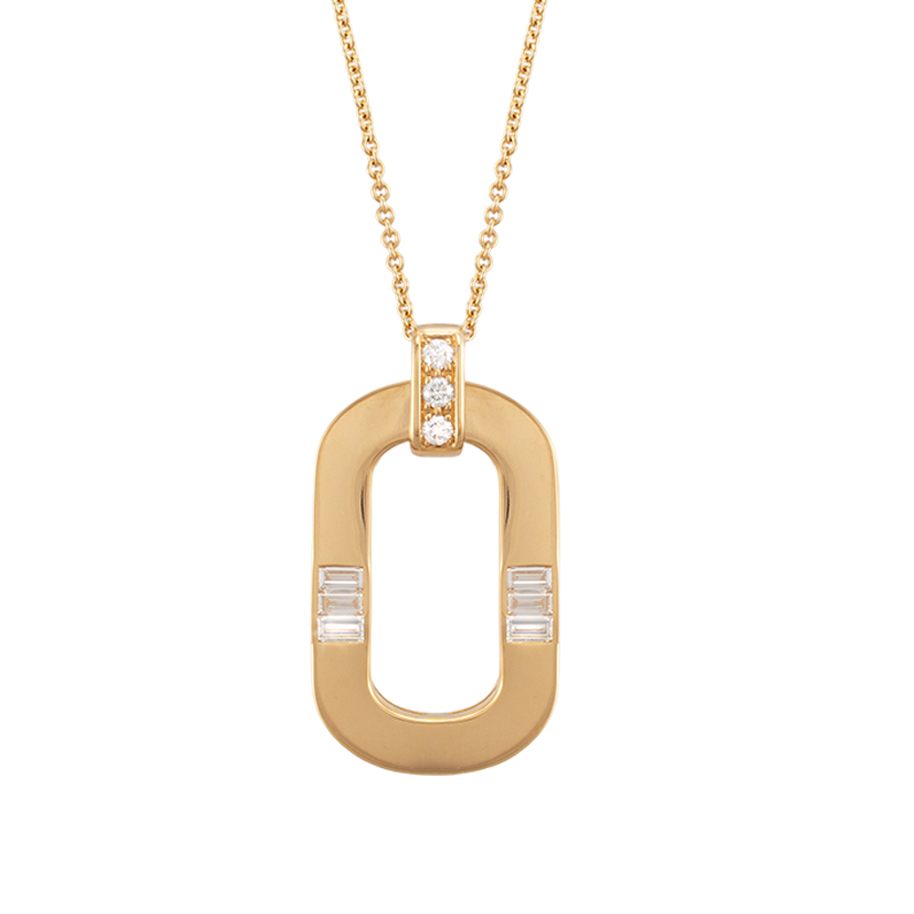 Halskette mit Anhänger in Gelbgold mit weissen Diamanten im Baguette – und Rund-Schliff.