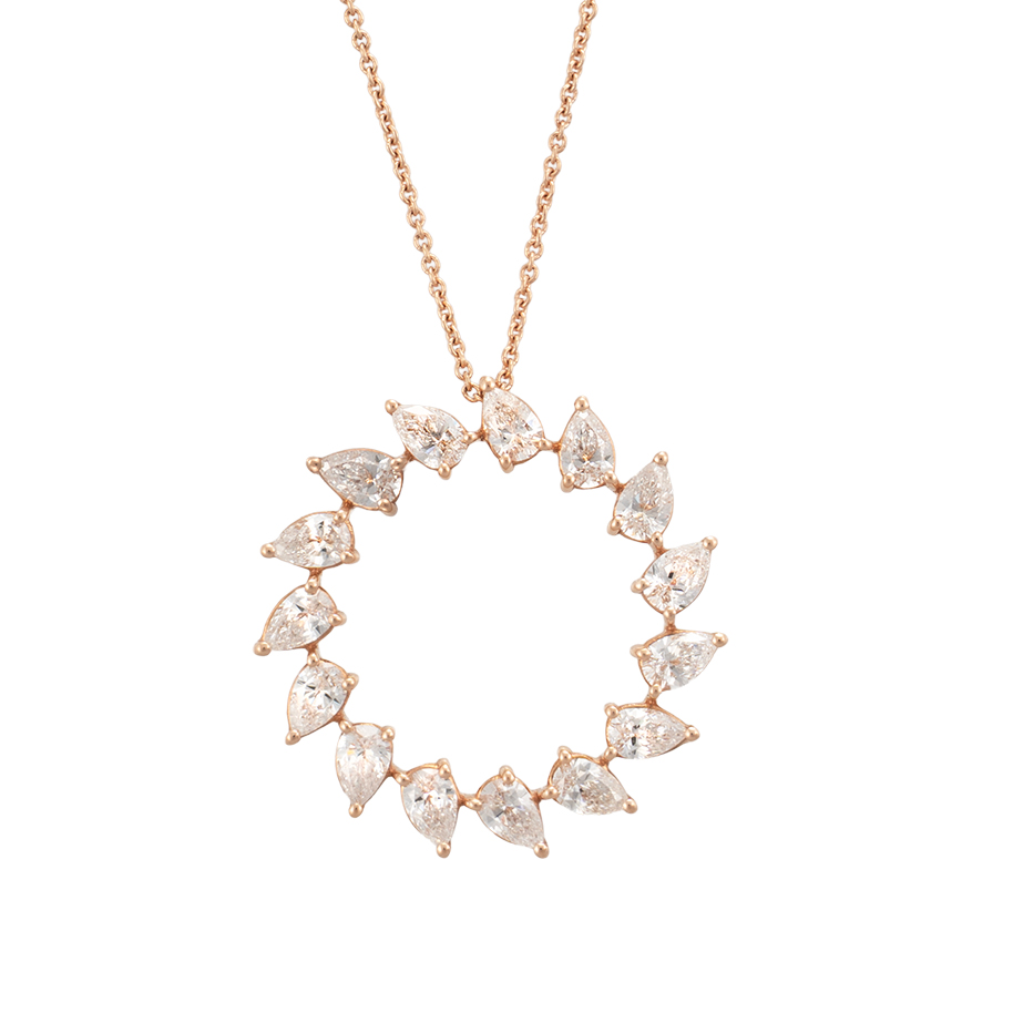 Halskette mit Anhänger in Rosegold mit tropfenförmigen Diamanten.