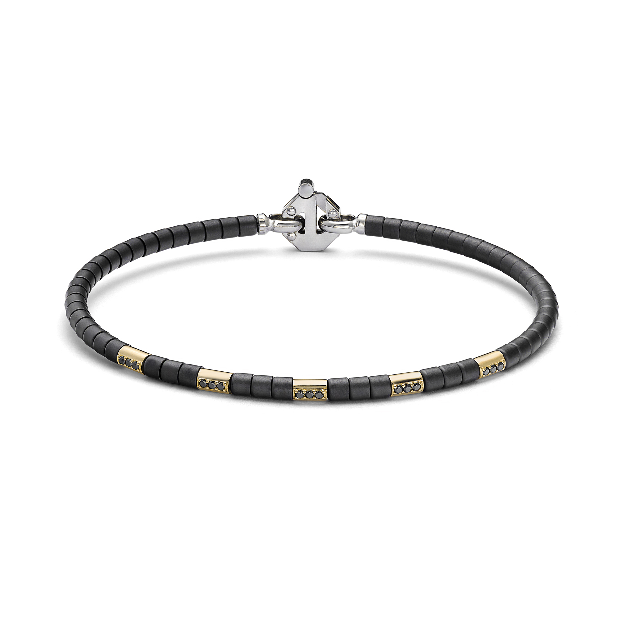 The Barakà men’s bracelet combines premium materials into a contemporary, striking piece. 750‰ yellow gold, titanium, stainless steel, and ceramic create a bold composition that conveys both strength and elegance.