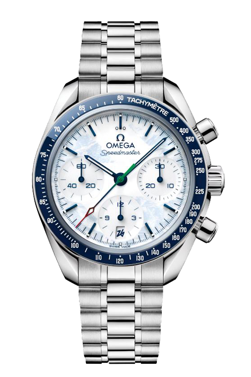 The 38 mm stainless steel case is enhanced by a striking blue ceramic bezel, giving this Speedmaster a modern and distinctive character. At its center, the white dial stands out with its refined texture, evoking a wintry atmosphere and the beauty of snow-covered landscapes. The design reflects the dynamism of winter sports, creating a truly unique identity.