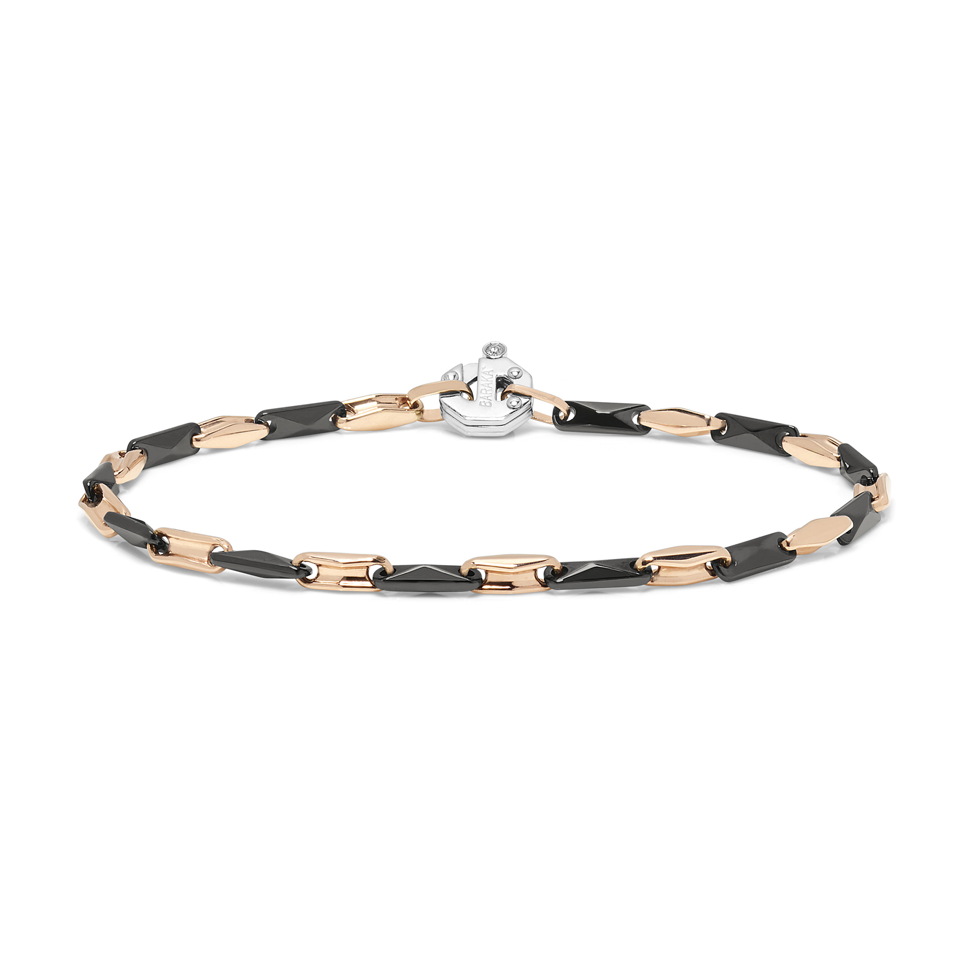 Il bracciale da uomo Barakà unisce design contemporaneo ed eleganza decisa in un accessorio dal forte carattere. Realizzato in pregiato oro rosa 750‰, si distingue per l’abbinamento raffinato con la ceramica nera, che dona al gioiello un contrasto moderno e sofisticato.