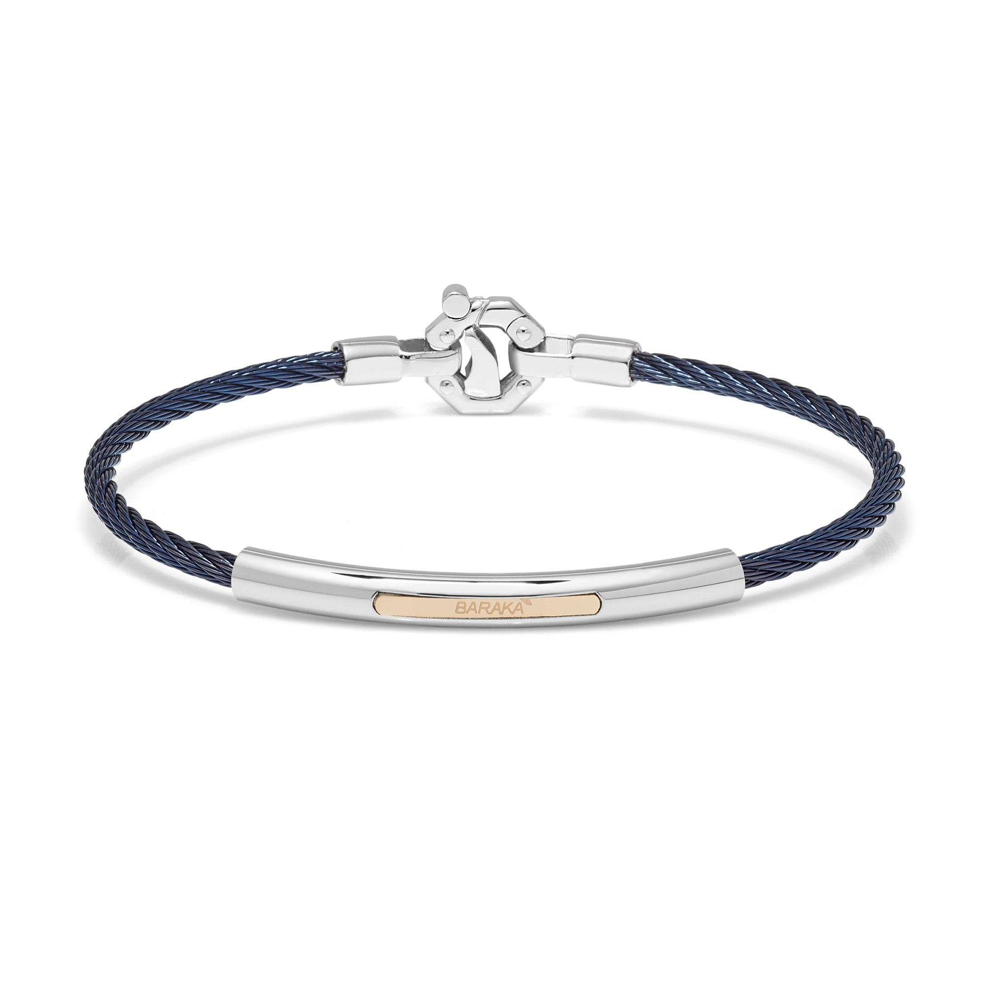 Questo bracciale Barakà da uomo esprime un’eleganza moderna con un carattere deciso e contemporaneo. L’incontro tra oro rosa 750‰ e acciaio crea un raffinato contrasto, valorizzato da un’esclusiva finitura PVD blu che dona profondità e un tocco dinamico al design.