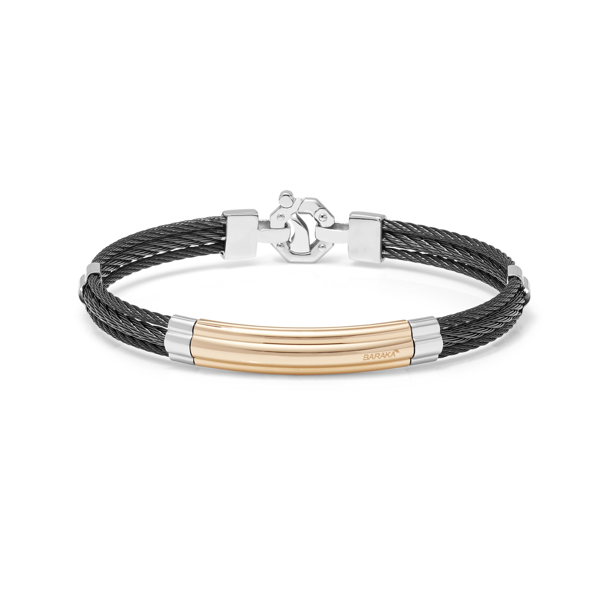 Il bracciale da uomo Barakà si distingue per il suo carattere contemporaneo e la combinazione equilibrata dei materiali. Oro rosé 750‰ e acciaio si uniscono a sottili dettagli neri, creando un gioiello elegante da indossare ogni giorno.