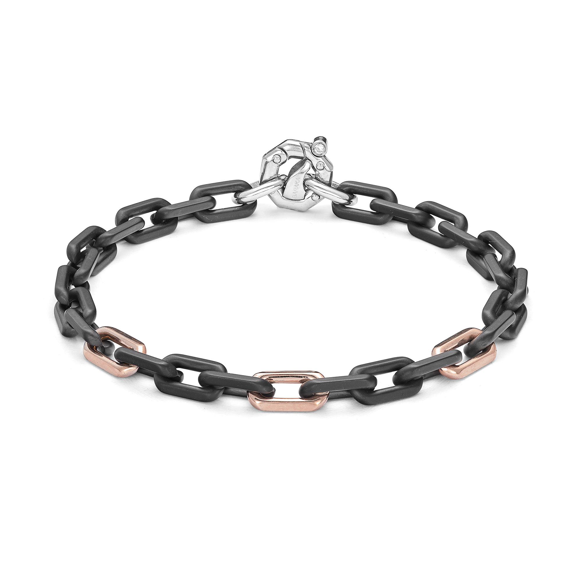 Il bracciale da uomo Barakà unisce materiali preziosi in un gioiello elegante e contemporaneo. Oro rosa 750‰, acciaio e ceramica conferiscono al bracciale raffinatezza e modernità.